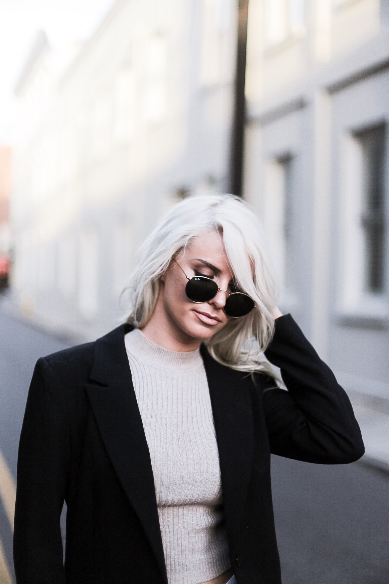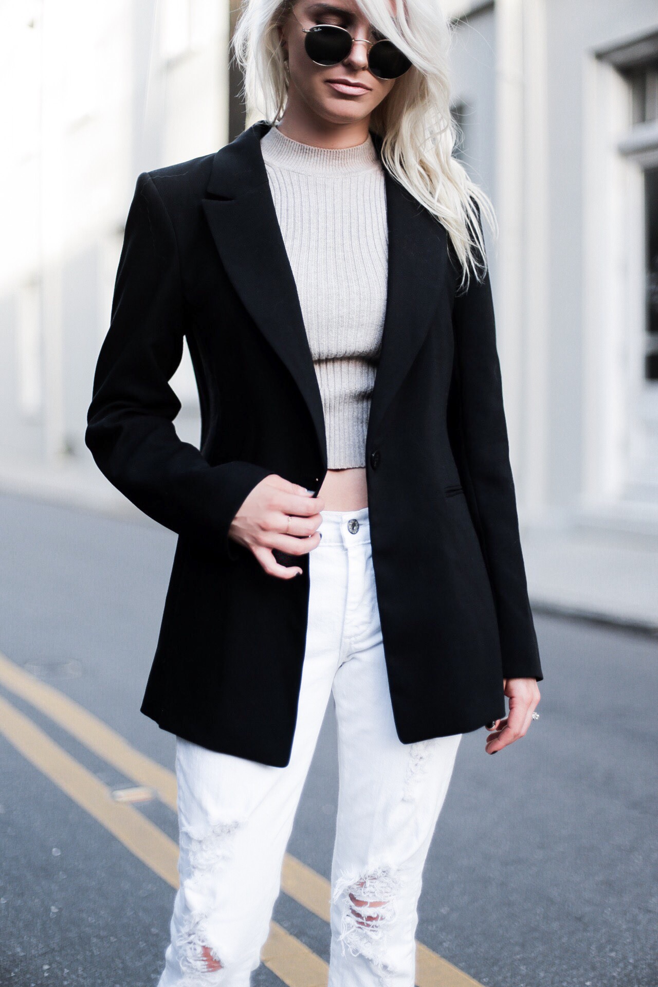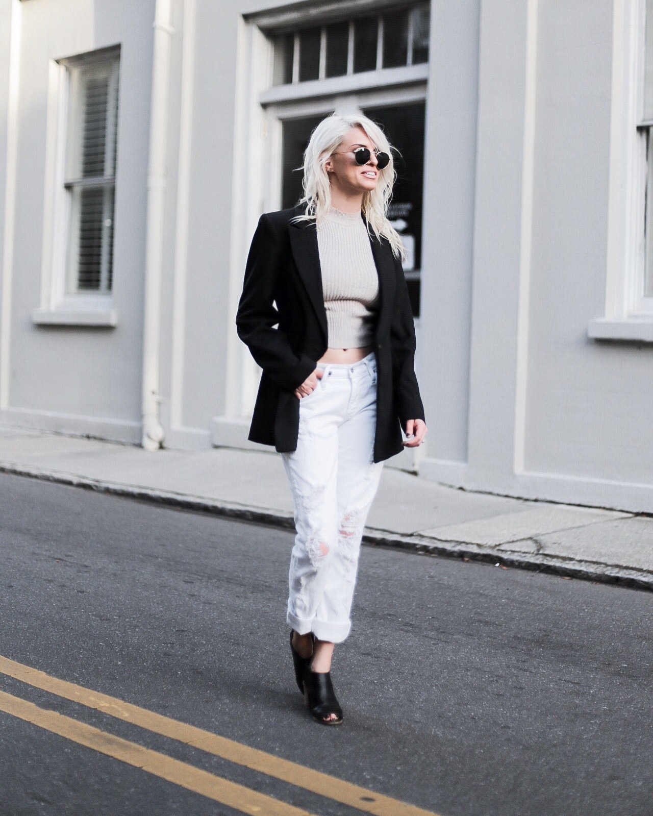 longline blazer // ribbed mock neck tank/crop top // distressed boyfriend jeans // peep toe mules // round sunglassesย